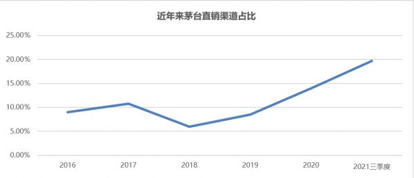 据统计,近年来茅台直销渠道占比从18年最低的5.95%提升至2021年三季度的19.67%。而自2019年开始有明显的加速趋势。