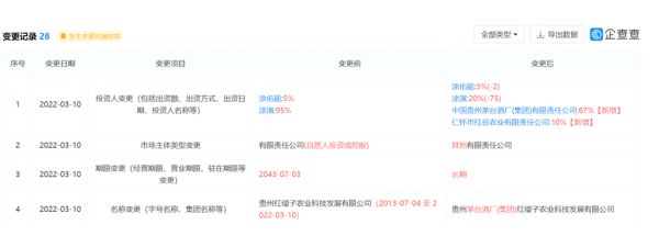 企查查数据显示,贵州红缨子农业科技发展有限公司于2022年3月10日变更为贵州茅台酒厂(集团)红缨子农业科技发展有限公司,茅台集团是新进股东,持股67%。