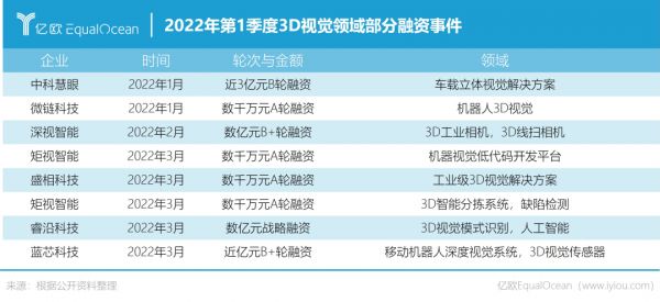 据亿欧不完全统计,仅2022年第一季度,3D视觉领域发生融资就超过10起。而2021年上半年3D视觉领域融资事件一共也才14起,3D视觉领域的融资频次和密度同比显著增高。