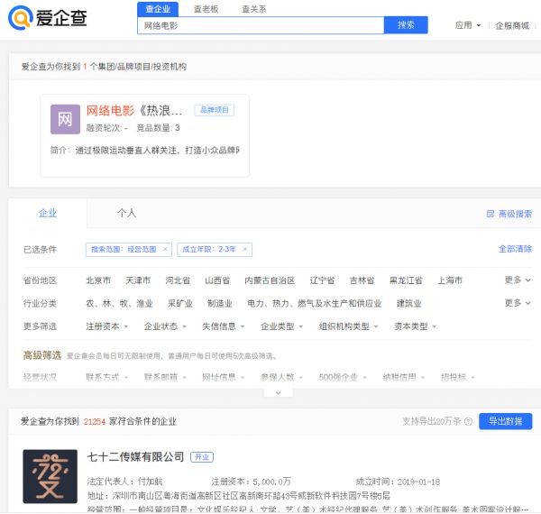 (图源:爱企查)经营范围包含“网络电影”关键词的公司多达21254家