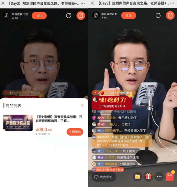 而切换到卖货模式之后,“老师”的带货能力不输李佳琦。一边抽奖,一边发放限量优惠券。抢到直播间专享福利,券后学费仅需8800元。