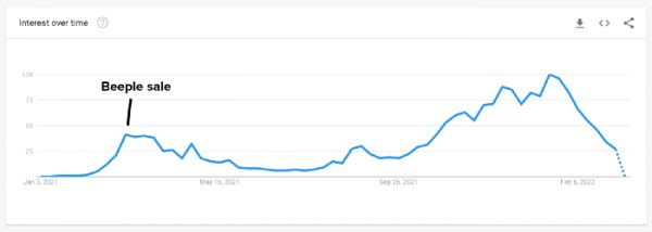 准确来说,NFT 并非新概念,它早在 2017 年因区块链养猫游戏 CryptoKitties 就曾小小“出圈”过一把,去年由于 Beeple 和元宇宙爆火再度掀起了新一轮热潮(注:许多人认为元宇宙将成为使用这些 NFT 的数字“游乐场”)。