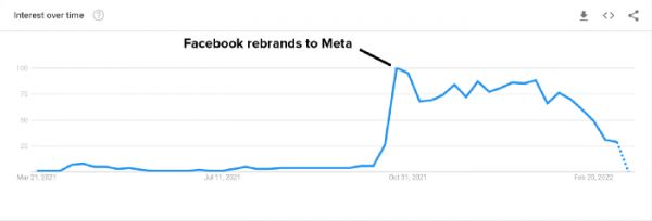 除此之外,如果查看 Chrome 浏览器中“元宇宙”的搜索趋势,可以发现其热度巅峰即为 Facebook 更名,此后整体呈跌落趋势: