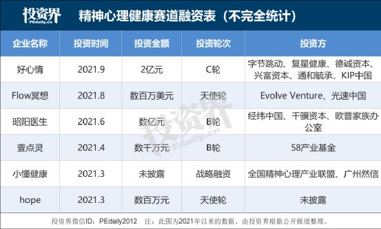 根据桔子IT数据显示,2021年至今,心理健康领域共发生投融资17次,累计投融资金额超过15亿元。其中,更不乏互联网巨头身影——2021年9月,字节跳动领投了心理健康数字化服务平台好心情2亿元的C轮融资,刷新了当时国内心理健康赛道最大单笔融资记录。