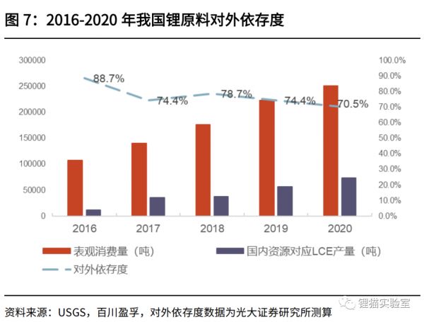 虽然我国也蕴含锂矿资源,但国内云母的原矿中碳酸锂成分含量较低,普遍在0.3%和0.4%,200吨原矿才能产1吨碳酸锂,生产难度较大。另一方面,我国锂资源仅占世界总储量不到6%,因此锂原料仍然大量依赖于进口,2016年以前对外依存度高达88%。
