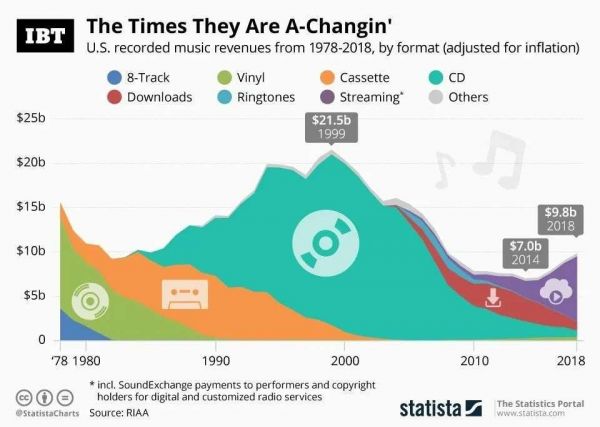 21世纪伊始,在互联网的冲击下,实体唱片市场出现了大滑坡,作为市场主体的CD,自2001年起销量连年下跌。国际唱片业协会IFPI的数据显示,2020年,全球CD销售额是28亿美元,比2000年下跌了将近90%。