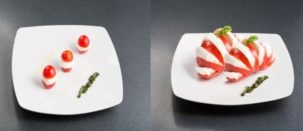 两份番茄沙拉的差别主要在摆盘。一份是3个精致的小番茄,巧妙地排在盘子的对角线上,一份则是2只个头更大的番茄切片。实验结果表明,被试们认为左边这盘外观更有吸引力,显得更优雅。