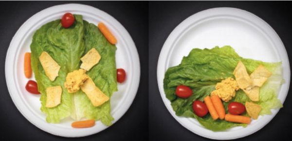 实验中的两种摆盘:一盘是将土豆泥和生菜放在盘子中央,并将饼皮环绕在土豆泥的四周,其它蔬菜则对称地分布在盘子周围;另一盘就是将所有菜都堆叠起来。丨参考文献[2]