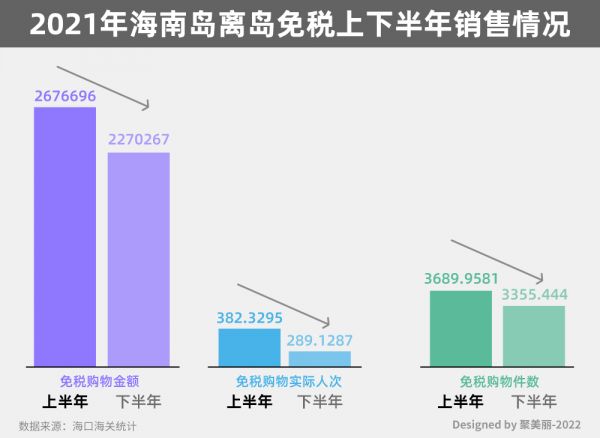 同时,仔细剖析2021年海南省离岛免税业务的销售数据,我们发现疫情对离岛免税业务造成了巨大的冲击。数据显示,2021年,1-6月海南离岛免税销售额为267.6亿元、件数3690万件、免税购物实际人次382.3万人次;7-12月海南免税销售则出现下滑,销售额为227亿元、件数3355万件、免税购物实际人次289.2万人。