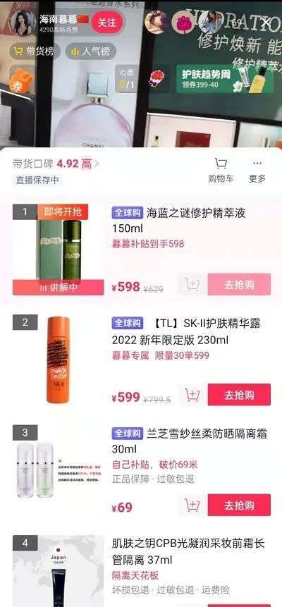随着免税品企业开启线上直播,一部分代购同样转向线上,利用直播的形式代购。在抖音上,这类直播间一般以免税店或者专柜为背景,以超低的价格吸引消费者。如抖音账号@海南暮暮便宣称是三亚专柜直播,其直播间内海蓝之谜修护精粹液仅需598元、雅诗兰黛小棕瓶精华100ml仅需575元。