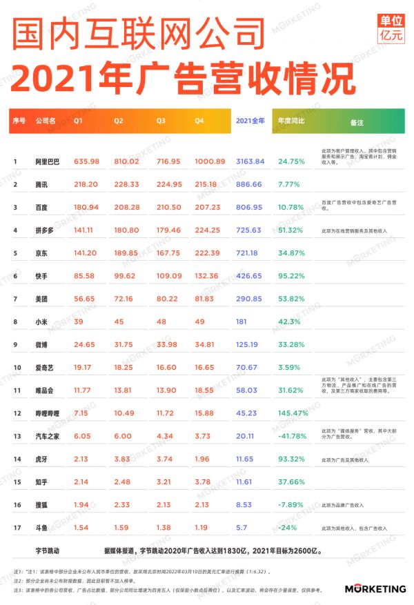 另外,腾讯、百度已常年霸榜榜单前五,2021年广告业务分别实现了886.66亿元、806.95亿元,年度分别同比增长7.77%、10.78%。聚焦在短视频、直播领域的快手,其广告业务发展更是不容小觑,增幅接近100%。2021年,快手广告营收达到了426.65亿元,同比猛增95.22%。