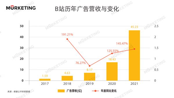 再来看B站,2021年增速超过2020年,接近150%,广告营收达到45.23亿元,是2017年的近30倍。