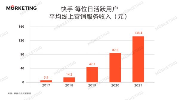 2021年,快手获得广告营收426.65亿元,每位日活跃用户平均线上营销服务收入138.4元,是2017年的23倍之多。而且,快手广告主数量不断增长,2021年增长超过了60%,广告主的月均消费额取得了双位数的增速。