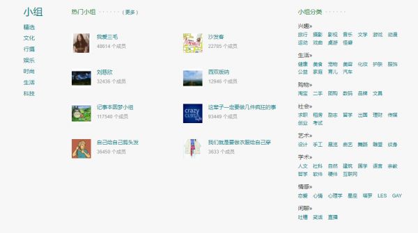 除了影音书库之外,豆瓣最受欢迎的就是小组功能,一个个兴趣小组成为了网友们交流、讨论和提问的空间,大家可以将小组视为一个创建条件更宽松、管理也更宽松的贴吧。
