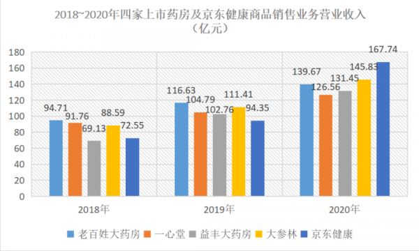 数据显示,2020年时,京东健康的药房零售业务的营收已经超过老百姓大药房、一心堂等四家线下连锁药店。