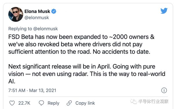 而在此值得一提的是,特斯拉坚持的是“纯视觉路线”,不适用激光雷达和ISP等。2021年第一季度财报电话会议上,马斯克表示不需要雷达,因为人类就是只使用视觉来驾驶。2021年5月,特斯拉宣布从当月起交付的所有 Model 3和 Model Y车辆将不再配备雷达。相反,这些车辆将利用特斯拉的“Pure Vision”方法,该方法仅使用其八个外部摄像头来执行半自动驾驶功能。并在去年的AI Day上表示,HW 4.0将“干掉ISP”的计划。
