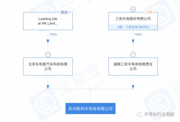 3月23日,理想汽车与三安光电投资成立了苏州斯科半导体公司。企查查股权穿透显示,该公司由理想汽车关联公司北京车和家汽车科技有限公司、三安光电全资子公司湖南三安半导体有限责任公司共同持股。经营范围含电力电子元器件、半导体分立器件制造销售;电子元器件制造等。
