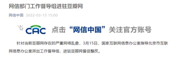 3月15日下午,国家网信办通报称,针对当前豆瓣网存在的严重网络乱象,3月15日,国家互联网信息办公室指导北京市互联网信息办公室派出工作督导组,进驻豆瓣网督促整改。