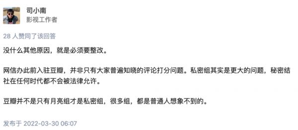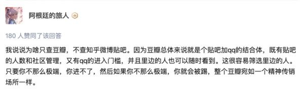 豆瓣有一套自己的体系,首先豆瓣的各种小组介于贴吧和微信群之间的状态,相比于贴吧有加入门槛,在贴吧浏览发言不需要吧主批准,吧主是事后管理。而加入小组就经过了筛选,小组与组长更加紧密。它又具备论坛的形态,在删帖、控评上更方便操作,随便去知乎上搜一搜,映入眼帘的大多都是饭圈洗脑、控评的证据。