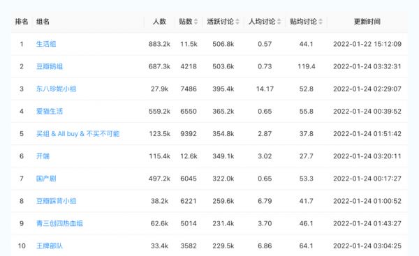 即便豆瓣使用多方位措施,对娱乐类小组进行限流,但该类小组依然流量凶猛。在上述排名中,截止今年1月24日,前50榜单中有18个为娱乐类小组。