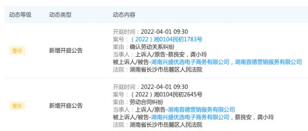 企查查相关数据显示,兴盛优选新增关于劳动合同纠纷和劳动关系纠纷的案件也不少,近30天内增加了5条开庭公告。