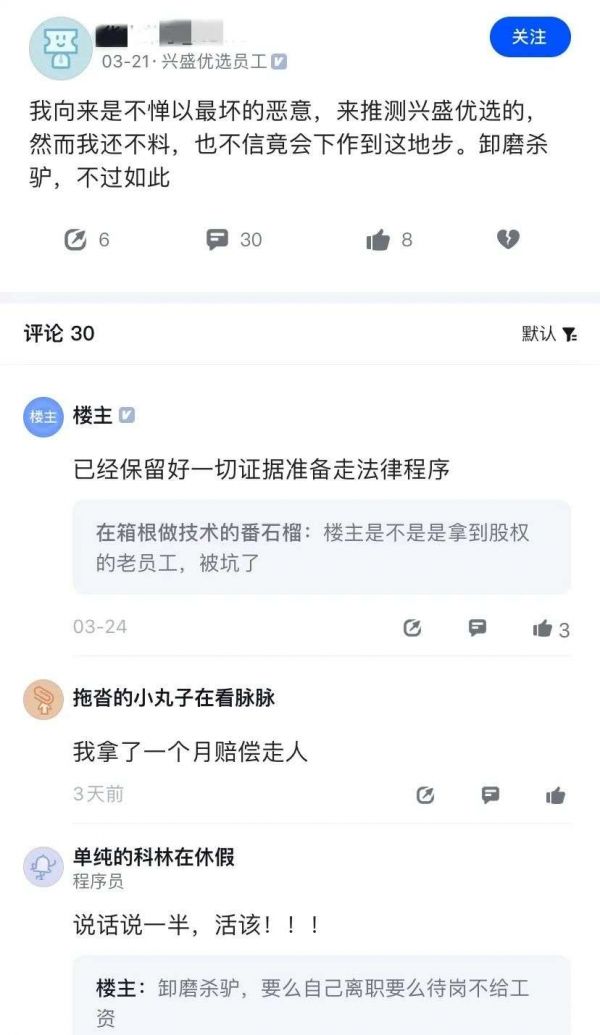 3月24日左右,认证为兴盛优选员工的两名网友在脉脉上爆料,“我拿了一个月赔偿走人。”“卸磨杀驴,不过如此,已经保留好一切证据准备走法律程序。”原本人员汰换率就相对高的兴盛优选,近期似乎也出现了裁员动作。