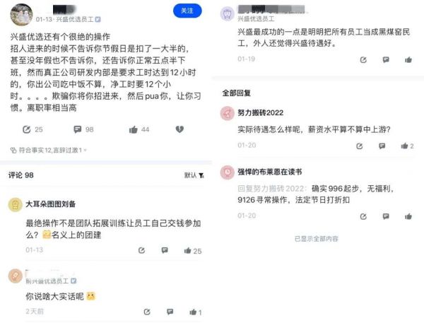 “兴盛最成功的一点是明明把所有员工当成黑煤窑民工,外人还觉得兴盛待遇好。”在脉脉等社交媒体平台上,不少内部员工吐槽兴盛优选“996”单休、福利差、法定节假日打折扣等问题。