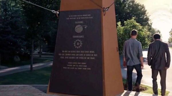 《星际穿越》中,太空基地库珀站上的石碑刻着英国诗人狄兰·托马斯的诗歌《不要温和地走进那个良夜》|《星际穿越》剧照