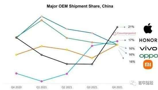 赵明这番豪言壮语倒也不是全无道理。据调研机构Counterpoint的统计报告来看,荣耀在去年第四季度的国内智能手机市占率上以17%的成绩排行第二,仅次于21%的苹果。