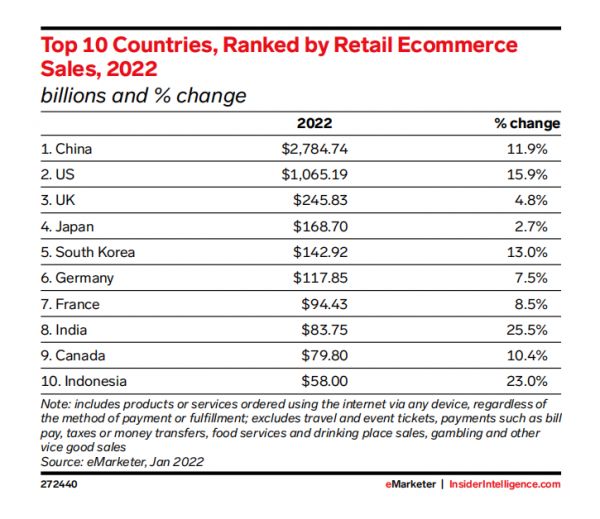 值得注意的是,日本电商市场正在快速增长,未来对运营人才的需求将会增加。据eMarketer最新数据显示,2022年全球零售电商销售额排名前10的国家,日本位列第四。