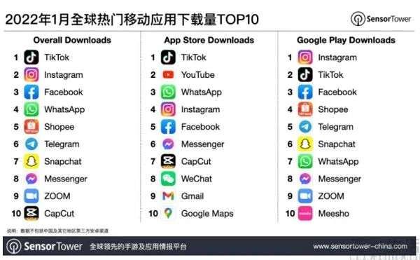 日前,根据SensorTower公布的相关数据显示,2022年1月抖音及其海外版TikTok以近6700万下载量,继续蝉联全球移动应用(非游戏类)下载榜冠军、同比增长7.1%。