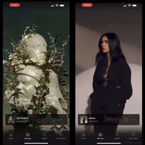 除了视频流媒体平台外,Spotify方面也已在去年开始测试短视频功能“Discovery”。并且其同样能够像在抖音/TikTok中观看竖屏短视频一样观看音乐MV或相关内容,并且也可以在视频下方一键“喜爱”歌曲。