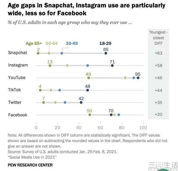 但不可否认的是,Instagram、Snapchat、TikTok等社交平台在年轻人群中依旧还有着着大量用户。其中在18岁至29岁人群中,使用Instagram的占比为71%、Snapchat和TikTok则分别为65%与50%,而TikTok的用户年龄则相对更小,其60%的月活跃用户年龄在16岁至24岁之间。