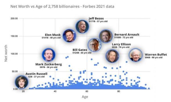 上面的图表显示,要想拥有更多财富,你需要时间:很大一部分亿万富翁的年龄在40岁以上。事实上,所有亿万富翁中只有4%的人年龄小于40岁。然而,有趣的是,越年轻的亿万富翁可能越富有:40岁以上的人的平均净资产是47.3亿美元,而40岁以下的人的平均净资产是51.2亿美元。人越年轻就越依赖于新兴行业来积累财富:40岁以下的亿万富翁中,有近三分之一是在科技行业致富的。