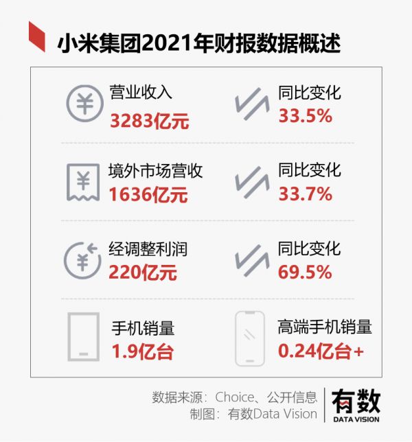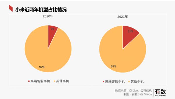 2021年,小米智能手机实现总营收3283亿元,同比增长33.5%,整体出货量达到了1.9亿台。具体到高端智能手机(零售价3000元人民币或300欧元以上),小米的出货量超过2400万台,一看占比,13%——与一年前华为退出时相差无几。