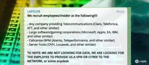 苹果、Meta之前,该黑客组织还攻击过微软、三星、英伟达,并经常在Telegram上求购一些大公司内部系统的访问权,有时还会向粉丝发起投票,征询下一次该攻击哪家公司。因为高调且屡屡得逞,Lapsus$名声大噪。截止到3月30日,Lapsus$的Telegram订阅量接近5万。