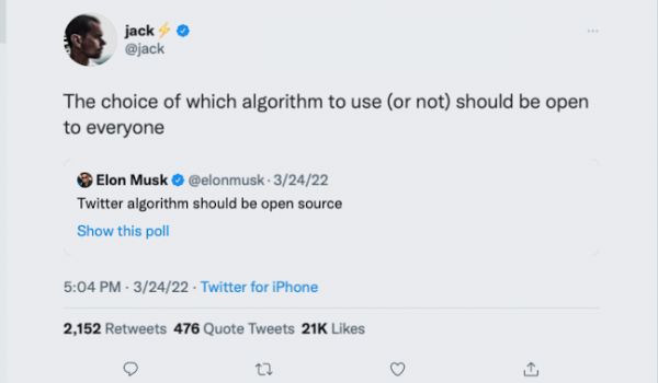 耐人寻味的是,在马斯克要求Twitter公布自己算法的时候,Twitter联合创始人、前CEO多西也公开转发表示支持,“使用哪种算法的选择应该向所有人公开”。