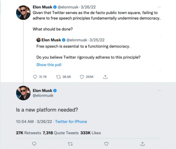 但马斯克是一个信奉“观点公开市场”的自由意志主义者,反对任何限制言论自由的措施。今年3月底,马斯克发了一系列推文,质疑Twitter的言论自由标准,要求Twitter公布自己的算法,甚至公开回应粉丝建议,表示会考虑组建一家新的社交媒体平台。