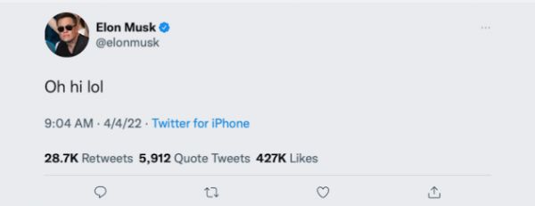在持股消息公布之后,马斯克在Twitter上发了一条:“Oh Hi Lol”看起来心情相当不错。