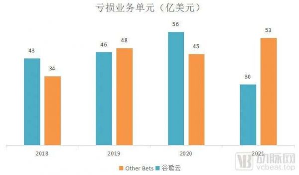 可以看到过去几年里,谷歌云和Other Bets都属于烧钱的项目。然而谷歌云属于逐步向好的趋势,营收逐渐增长,到了2021年,亏损大幅减少46%,并且增速跟上了主要对手的步伐。而Other Bets几年来营收没有本质的变化,亏损倒是一年比一年多,2021年更是达到53亿美元,约合人民币336亿。