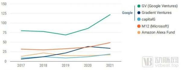 过去5年科技巨头特定风险投资部门的年度投资数量,数据源于CBInsights