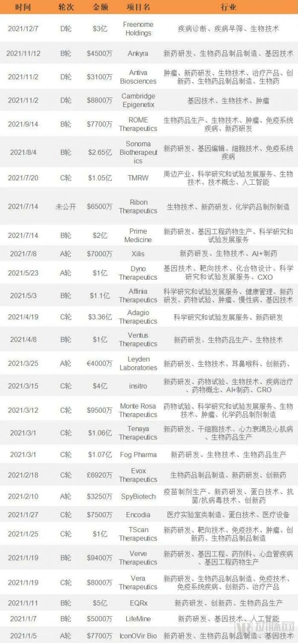 GV在2021年对药物研发初创企业的投资,数据源于动脉橙