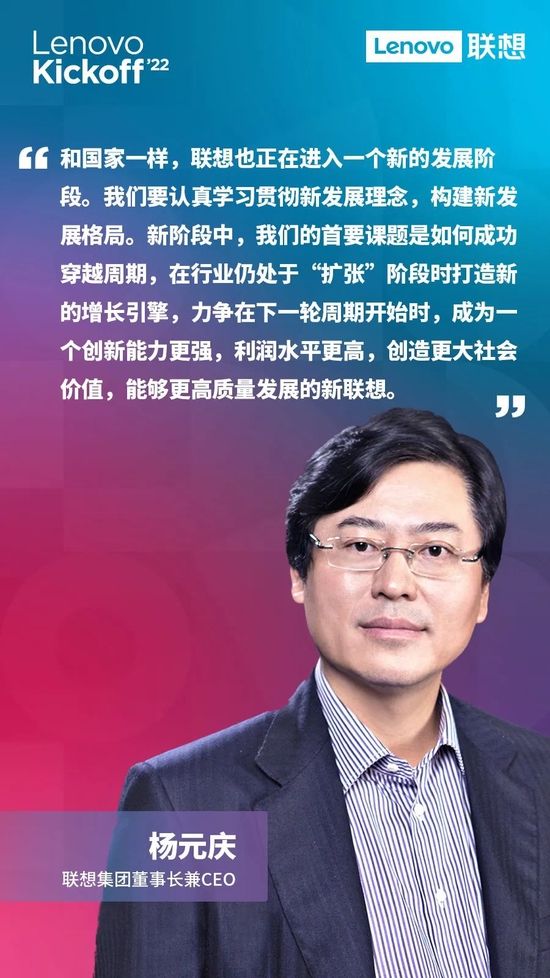 新财年、新征程、新周期、新起点,联想集团将秉承谦逊、开放、包容、共赢的态度,认真倾听客户声音,与合作伙伴携手共赢,与社会各界形成畅通的沟通机制,在新发展格局下,共同构建一个科技创新驱动、持续服务客户、创造更多社会价值的未来。