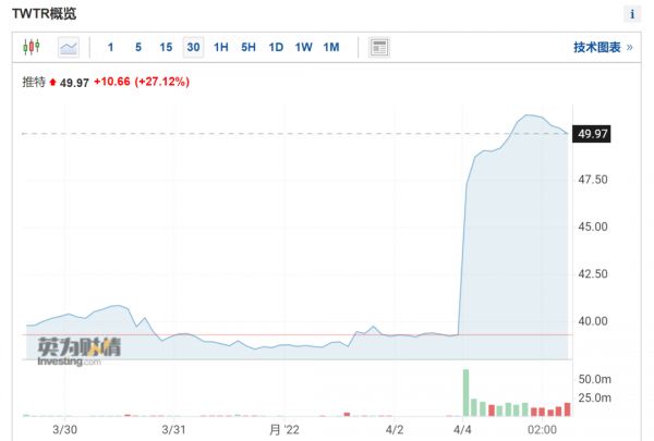 可能是得益于马斯克长期以来的财富先锋效应,此举使马斯克成为推特最大外部股东的同时,也使推特单日涨幅一度达到27%,创下近四年最大盘中涨幅。