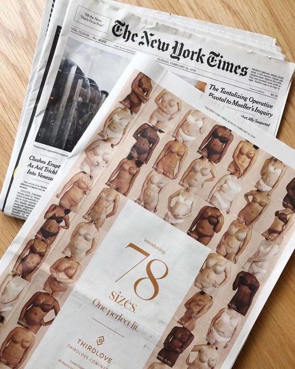 2019年2月,ThirdLove曾买下《纽约时报》一整个版面来宣传新品,最为重要的是强调她家有78个码数可供选择,数量是维秘的2倍之多。正如标题所表达的,ThirdLove能为每一位女性匹配最适合的一款内衣。