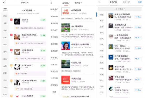 来源/燃财经截图图/分别为豆瓣、今日头条、知乎的小组/圈子界面