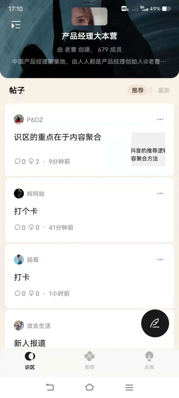 在【推荐】功能中,可以看见被用户推荐和区长点亮的帖子内容,以及推荐的识区。