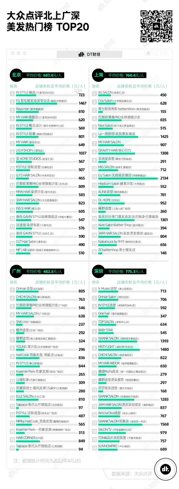 其次是上海,美发热门TOP 20店铺平均价格达到760.4元,北京是687.4元。而就算是价格最亲民的广州,要去TOP 20店铺美发,人均消费价格也达到了482.5元。