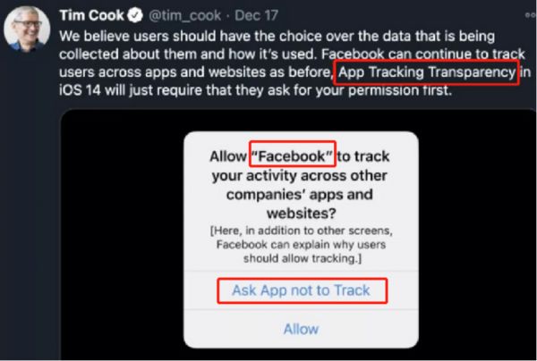 一直以来,Facebook通过苹果设备的IDFA(广告追踪码、广告ID),追踪每一个用户在其他电商App、新闻网站、社交论坛等的详细轨迹,比如他/她购买了什么,在时尚资讯网站里逗留了多久,在视频网站里看了宠物的视频是否点赞收藏,等等。