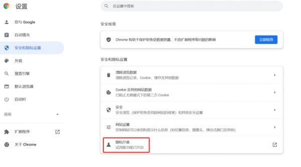如今,在亿观先生的谷歌Chrome浏览器上的“安全和隐私设置”里,已经出现了“隐私沙盒”。亿观先生从未进行过设置,应该默认开启的。